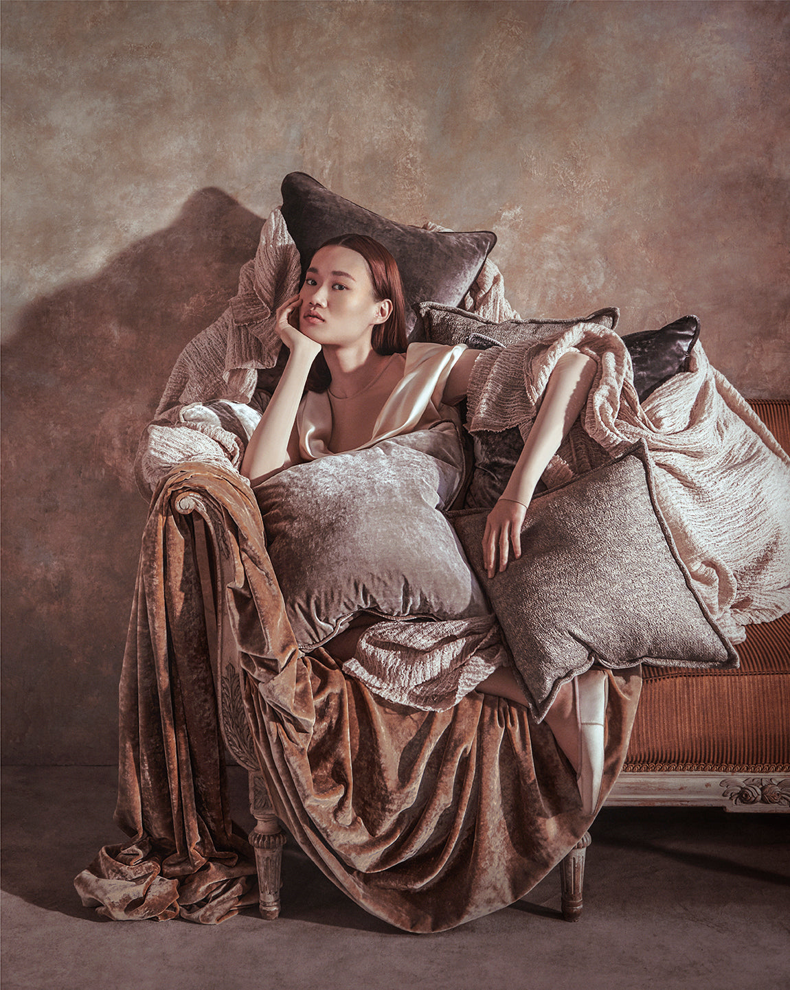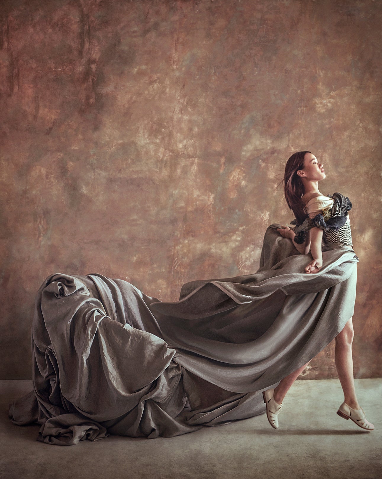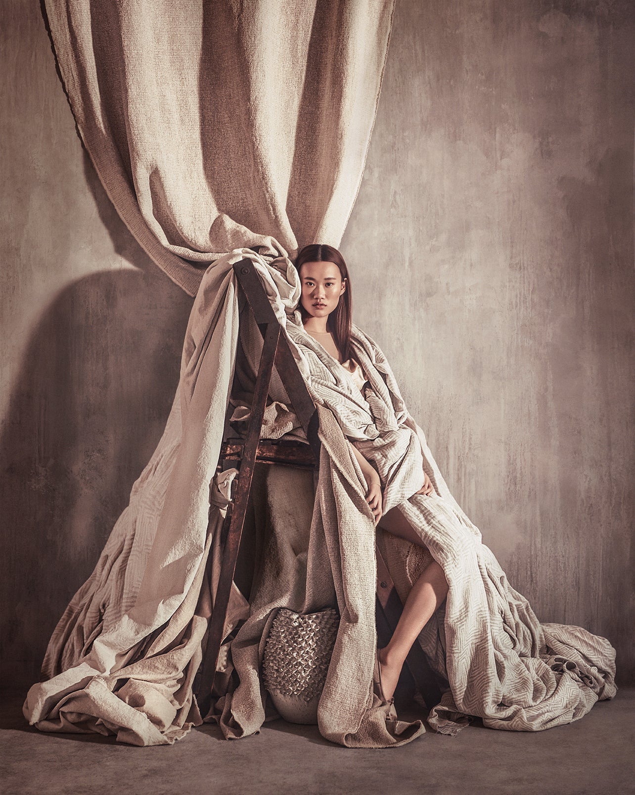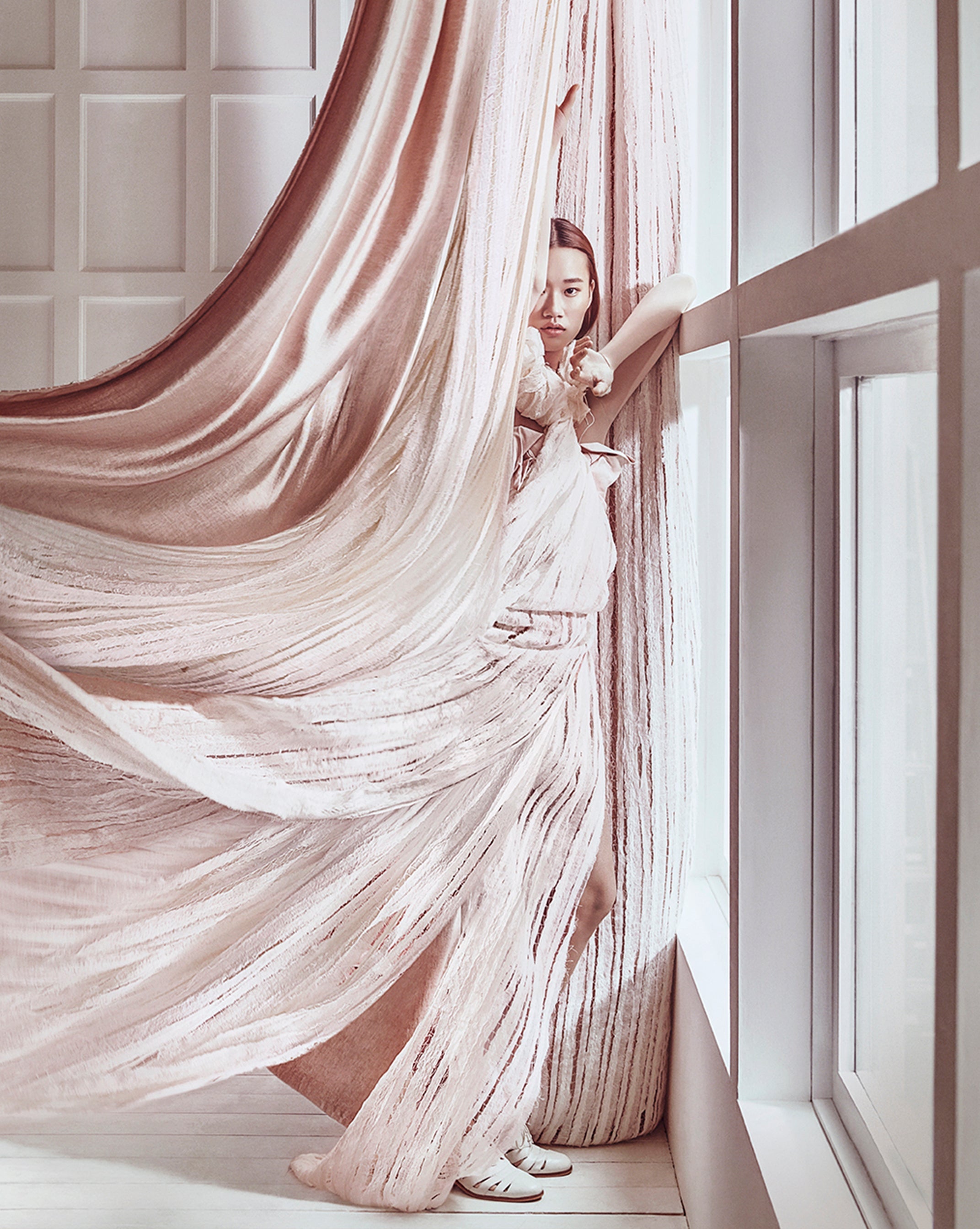 DRAPE FABRIC BEHIND MODEL IN MISTRAL SHELL