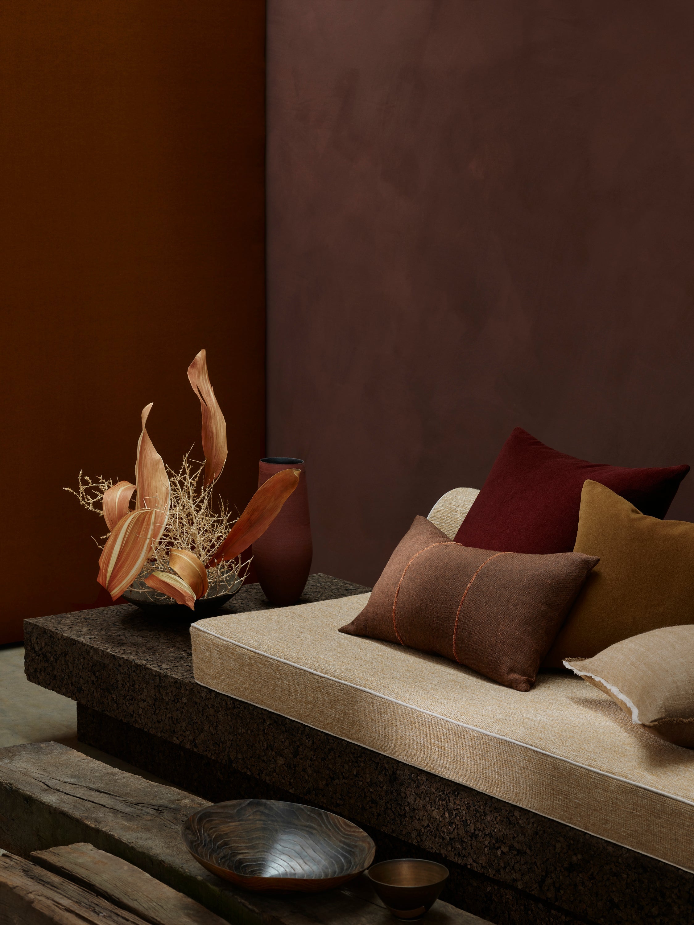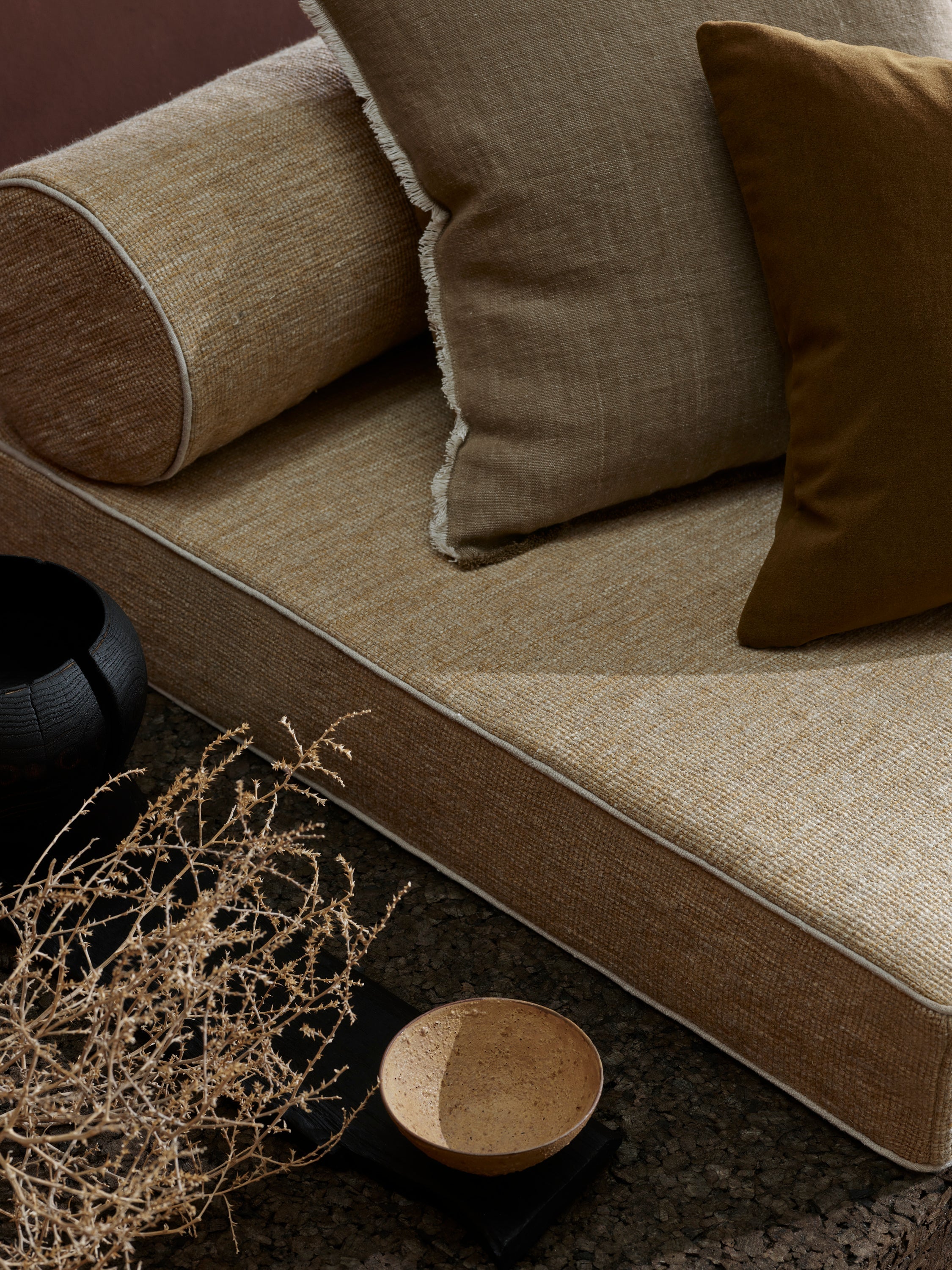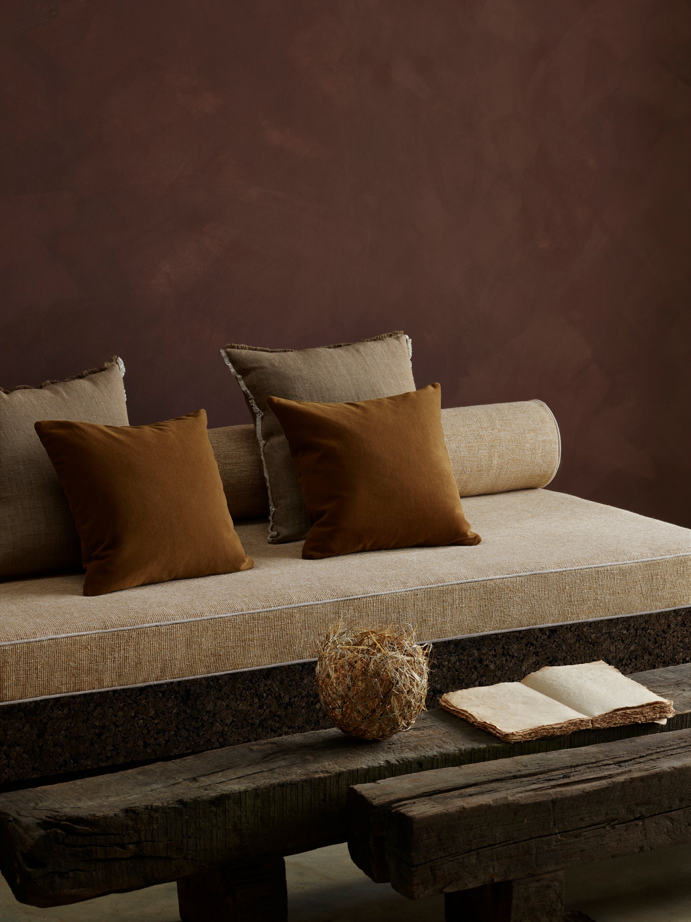 FRONT CUSHIONS ON THE DAY BED, MERINO VELVET IN MAPLE