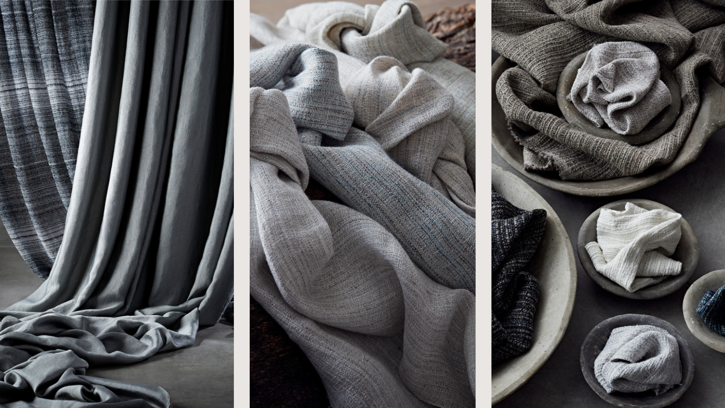 For beautiful curtaining, explore Pencil Sketch's subtle and finely woven demask pattern that exudes sophistication. For a sheer with a twist, discover Cascade in Tide, a fine boucle linen with an open-weave design, that creates waves of horizontal indigo ripples diffusing the light through a window with a subtle luminosity.