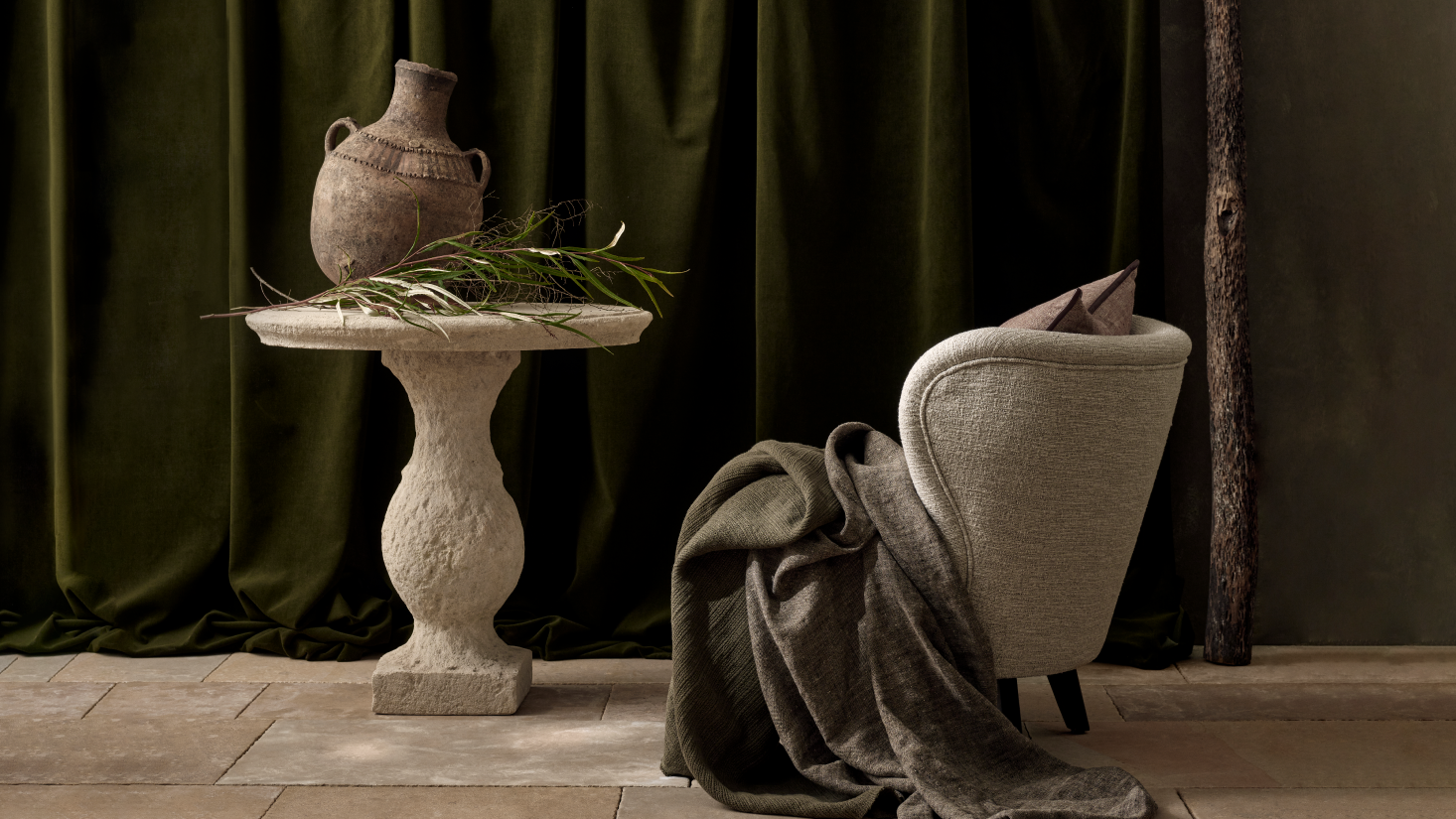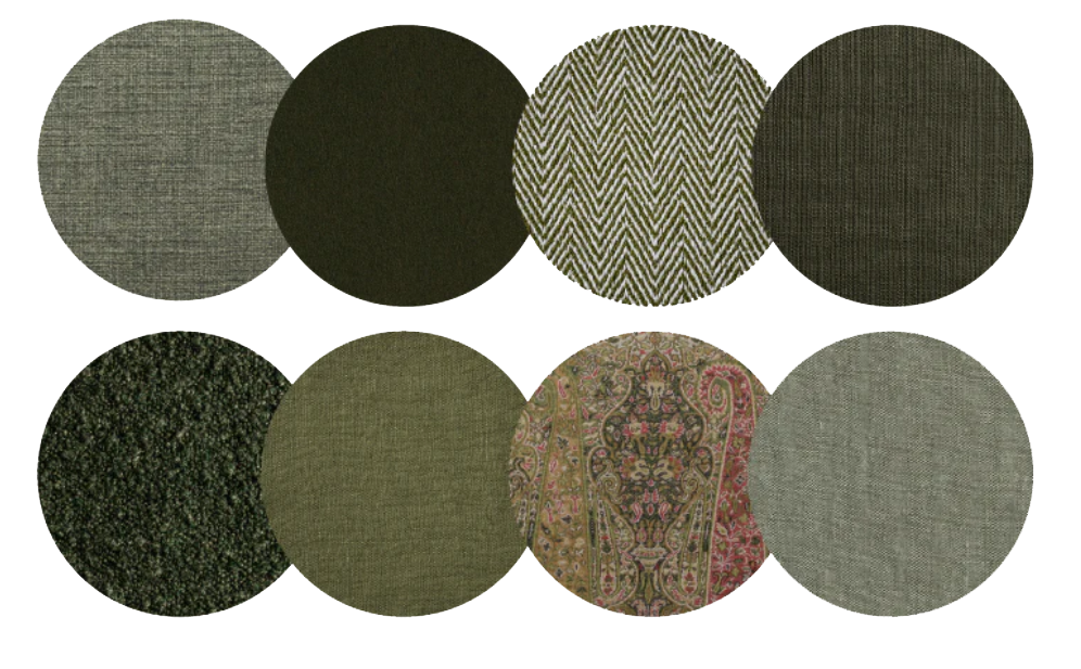 de Le Cuona's Grounded Green colour story showcases shades of green from the soft hues of sage and celadon, to the earthy tones of olive and moss, and the deep tranquil tones of forest and hunter green. From intricate paisleys to textured bouclés, the hand-picked edit includes a wide range of fabrics that could combine to create a space with character and balance.