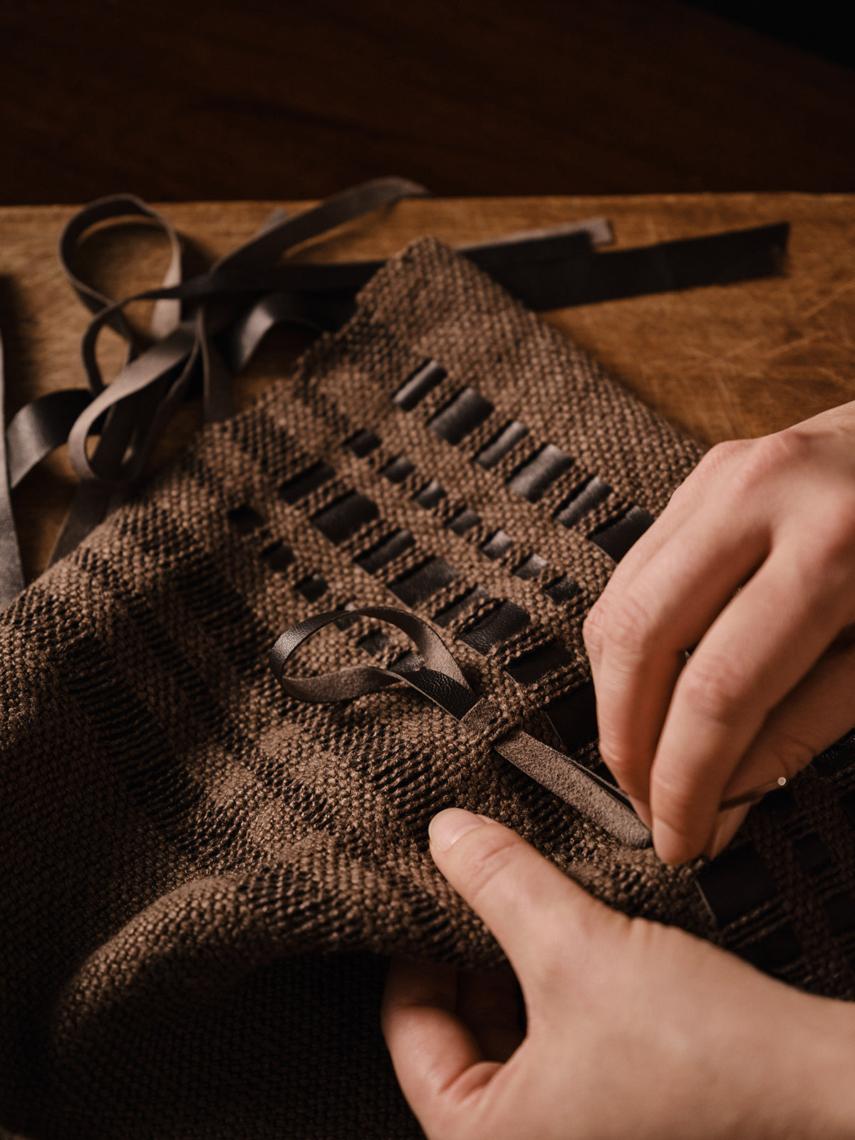 Different finishes, techniques, and trims can be used to create beautiful design details that enhance your bespoke accessory. From drawn thread-work and French seam details to knotted tassels and frayed fringing, or waxed cord and leather embroidery, it’s the details that add real artistry to custom-made pieces. Other signature de Le Cuona finishes available are suede and leather trims, piping, self-flange, borders, pin-tucks, covered buttons, panelling, quilting, knife edges, leather buckles, and leather corners.